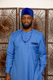This outfit is handcrafted in Cameroon and designed by tailors with high-quality 100% cotton and Bamileke ndop cloth. The blue hue of the fabric holds significance, representing the Bamileke elite. It is suitable for various occasions such as royal state events and ceremonies. This set includes matching shirts and pants for the complete outfit.