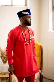 This African attire is meticulously handcrafted in Cameroon by skilled tailors using high-quality 100% cotton. The fiery red checkered set features the checkerboard Atoghu print on the pocket, symbolizing order, balance, and harmony, highlighting the significance of structure and equilibrium in both personal and communal life. Perfect for various occasions, including royal state events and ceremonies, this set includes matching shirts and pants for a complete, cohesive outfit.