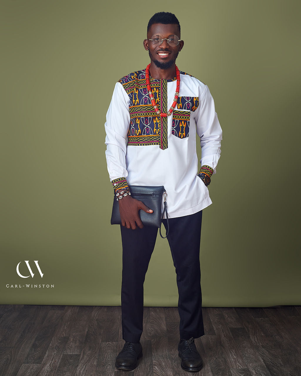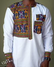 Crafted from durable cotton, the tunic features contrasting Toghu panels placed with intention across the chest, pocket, cuffs, and neckline. The white base creates space for the Toghu motifs to stand out clearly, while the structured fabric ensures the garment holds its form with confidence.