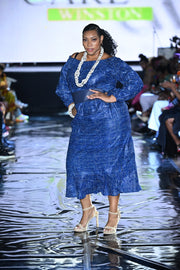 Celebrate timeless elegance with the Royal Indigo Heritage Dress. Handcrafted from indigo-dyed fabric with subtle dotted striping, this is a one size fits all dress that combines cultural tradition with modern runway appeal. Its off-shoulder neckline, long gathered sleeves, and ruffled hemline create a flattering silhouette that moves with confidence.